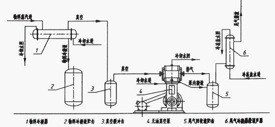 下圖是實際生產中應用的一個物料減壓回收流程示意圖。圖中,物料蒸汽在主冷凝器中被基本冷凝成液體,但在真空條件下,氣體分子運動速度加快,氣體密度減小,物料的凝結溫度下降,冷凝器的總傳熱系數成倍縮小,因而在真空下物料冷凝(一次冷凝)往往不是很充分,尤其是低沸點溶劑類。未被充分冷凝的氣體一部份在真空泵內隨著壓力的變化而液化,另一部份則在排氣側冷凝器中常壓下冷凝(二次冷凝)。 |